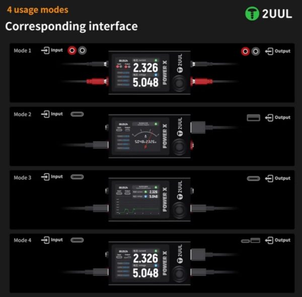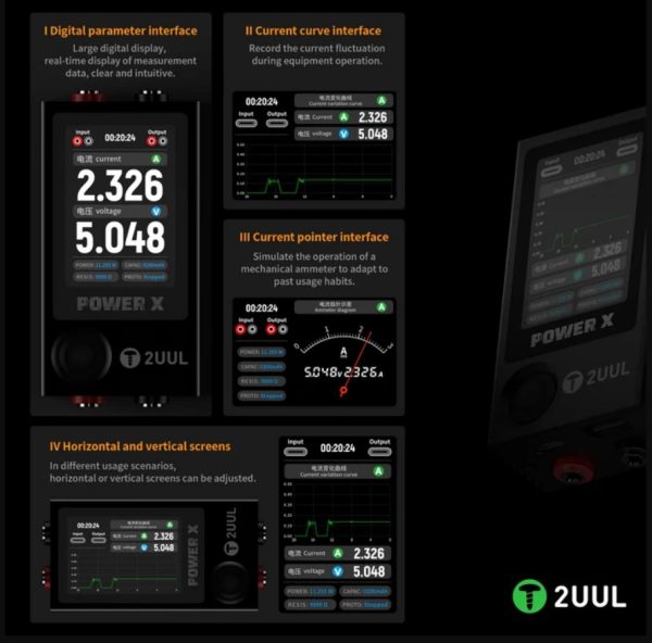 - این دستگاه اندازه گیری ولتاژ و آمپر دارای یک صفحه نمایش رنگی 2.4 اینچی HD