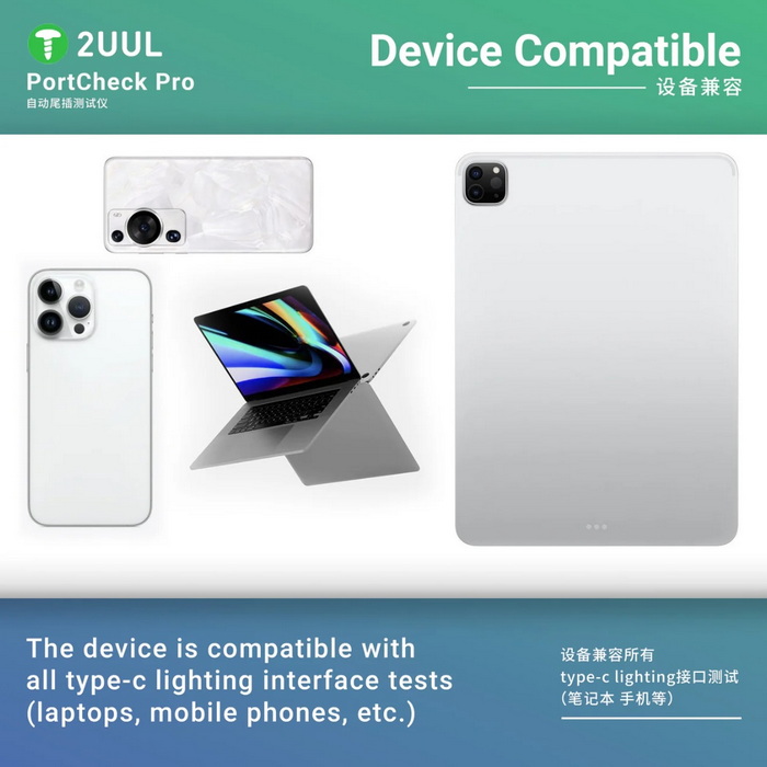 - پورت لایتنینگ برای گوشی های آیفون و پورت TYPE-C برای تست گوشی های اندروید و انواع لپ تاپ مورد استفاده است