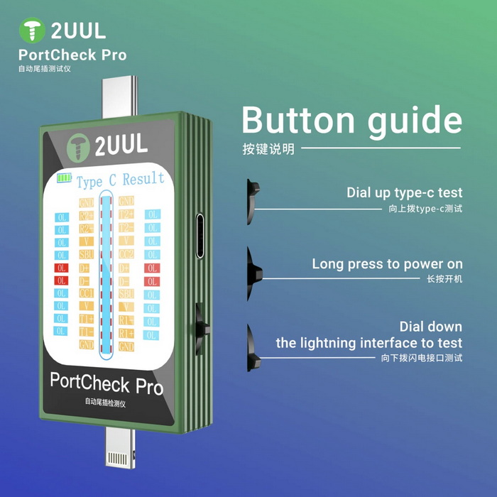 - با توجه به کلید تعبیه شده در کناره دستگاه میتوانید از کارآیی های مختلف آن استفاده کنید به این ترتیب که اگرنشانگر کلید در وسط باشد با فشار بر روی آن دستگاه روشن میشود ، در بالا باشد برای تست TYPE-C و اگر در پایین باشد برای تست LIGHTNING استفاده می شود