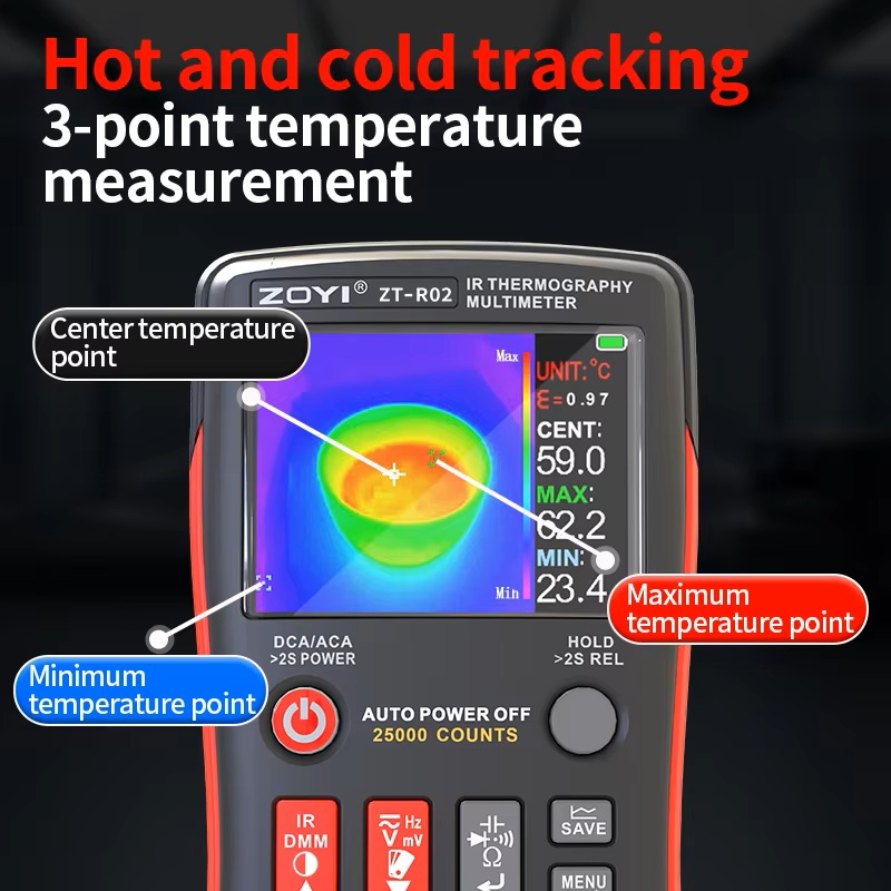دوربین حرارتی ZT-R02 دارای وضوح 96×96 پیکسل و قابلیت اندازهگیری دما در بازهٔ -۲۰ تا ۵۵۰ درجه سانتیگراد است. این ویژگی امکان شناسایی سریع تر نقاط داغ، اتصالات ضعیف، اضافهبار یا حرارت غیرعادی در تابلو برق، موتورها یا گرمای غیر عادی قطعات الکترونیکی را فراهم میسازد.