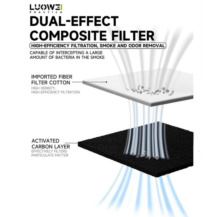 - دارای فیلتر کامپوزیت با دو لایه کربن و لایه پنبه دارای با چگالی و راندمان بالا برای تصفیه دود و همچنین مقدار زیادی از باکتری ها ( ابعاد : 65 * 65 * 9 میلی متر )
