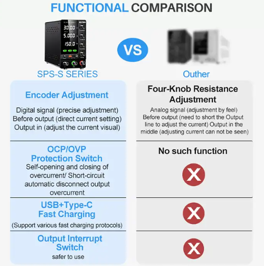 (هنگام اتصال کوتاه، خروجی محدود میشود)کلید قطع خروجی دارد ✔️ ندارد ❌ ندارد ❌ نوع ولوم انکودری (دقت بالا، سهولت در تنظیم دقیق) ولوم معمولی (دقت پایین، کاربری سخت) انکودری (دقت بالا، سهولت در تنظیم دقیق) نتیجه گیری