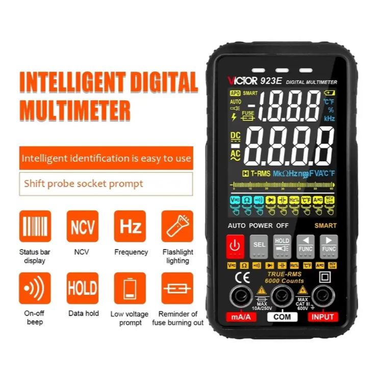 923E یکی از مولتی مترهای هوشمند و اتورنج تولید شده توسط شرکت ویکتور میباشد. از مزایای مولتی متر VICTOR 923E میتوان به نمایشگر تمام صفحه، تعیین فانکشن (پارامتر اندازه گیری) به صورت خودکار Auto Function Detection (Smart) و تعیین رنج اندازه گیری به صورت اتوماتیک (Auto Range)، اندازه گیری جریان های الکتریکی تا 10A، اطلاع از وجود ولتاژ به صورت القائی NCV، فازمتر Live، ظرفیت خازن و میزان مقاومت الکتریکی و … اشاره کرد. مالتی متر 923E یکی از مولتی مترهای دقیق با سایز کوچک و قابلیت Auto Scan میباشد.