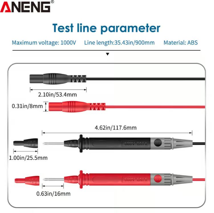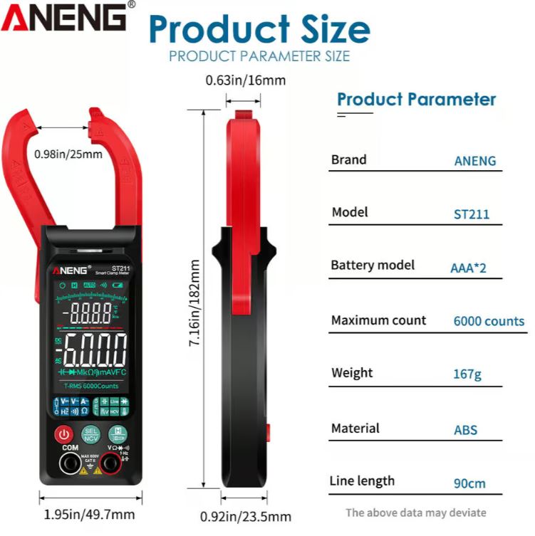 مولتی متر ANENG ST211 با بدنهای از جنس ABS مقاوم طراحی شده است که علاوه بر سبک بودن، دوام بالایی در برابر ضربه و شرایط محیطی دارد. این طراحی با رنگهای مشکی و قرمز، علاوه بر زیبایی، به دستگاه ظاهری حرفهای بخشیده است.
