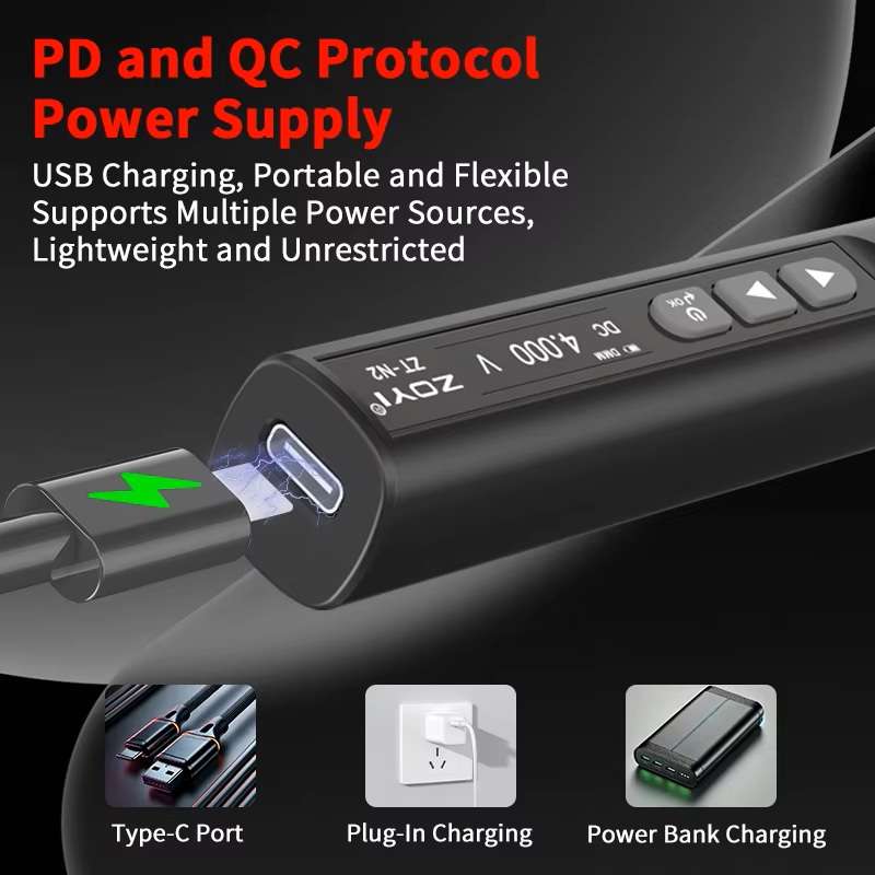 برخلاف مدل ZT-N1، دستگاه ZT-N2 به یک باتری لیتیومی داخلی مجهز شده است اما برای دستیابی به عملکرد بهینه و پایدار هویه، بهویژه در لحیم کاریهای طولانی یا سنگین، توصیه میشود از یک منبع تغذیه خارجی با توان بالا مانند پاوربانک یا شارژر سریع با پشتیبانی از پروتکلهای PD/QC استفاده شود.